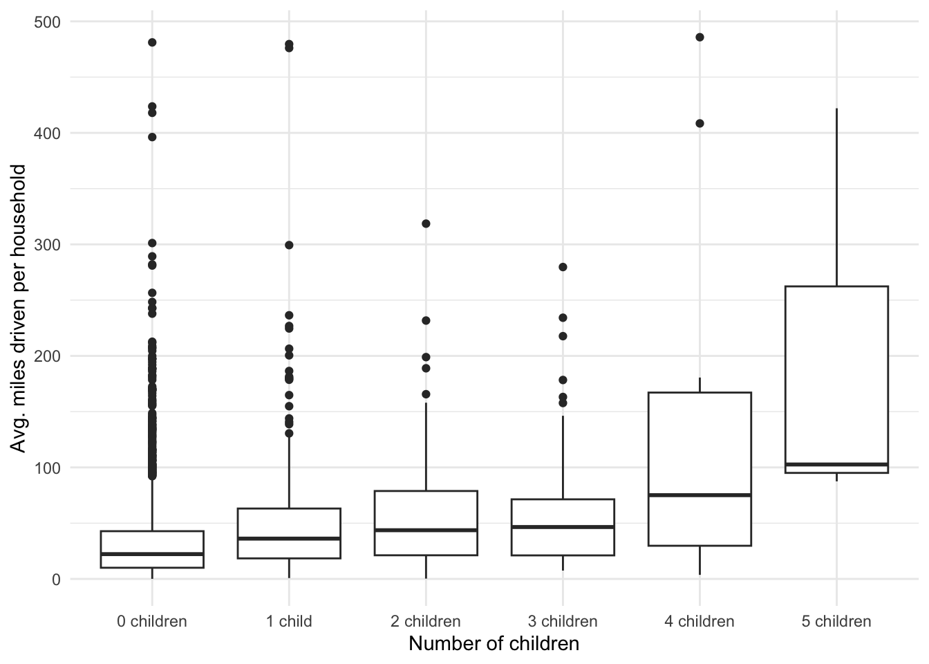 labs(x = 'Number of children', y = 'Avg. miles driven per household') +